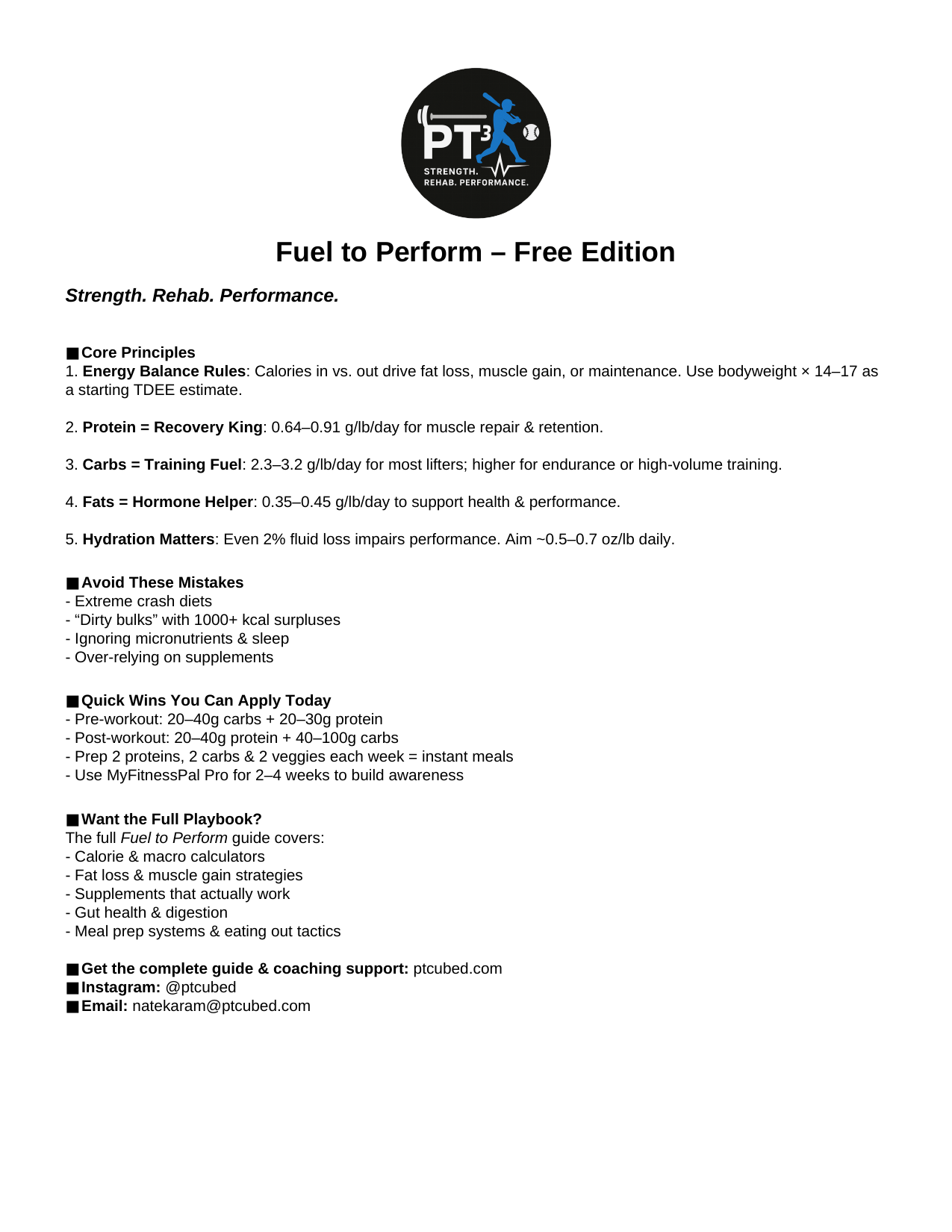 Take the guesswork out of fueling your gains. Fuel to Perform is your evidence-based guide to building muscle, boosting energy, and optimizing recovery. Whether you're chasing PRs or just trying to keep up with life, this playbook covers macros, meal timing, supplements, and real-world strategies you can actually stick to — no crash diets, no fluff. Just smart, sustainable nutrition for lifters who want results.