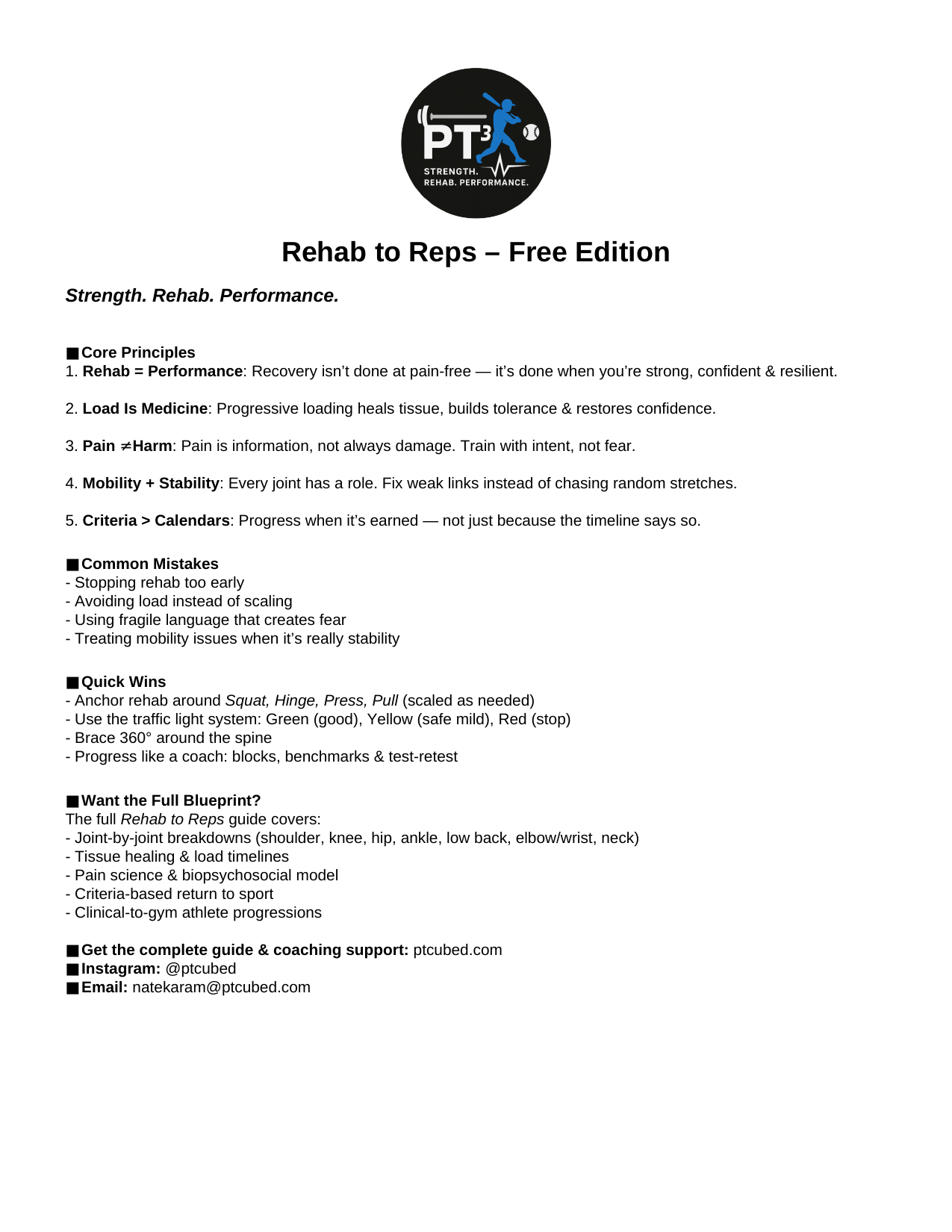 This isn’t your average rehab handout. Rehab to Reps is your blueprint for bridging the gap between injury recovery and real-world performance. Designed for lifters, athletes, and coaches, this 15 chapter guide breaks down how to train through and beyond injury using evidence-based strategies that actually belong in the gym.
